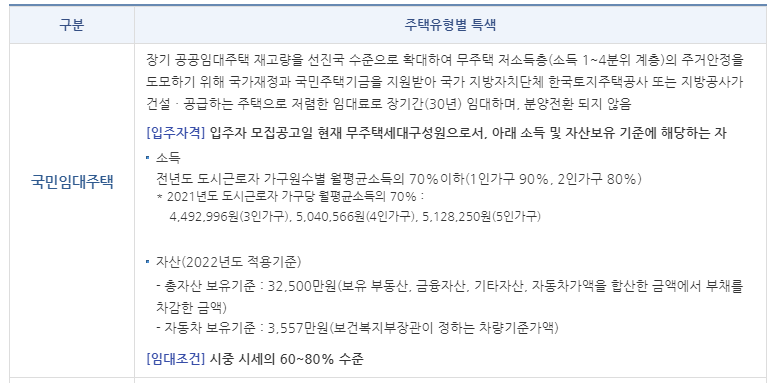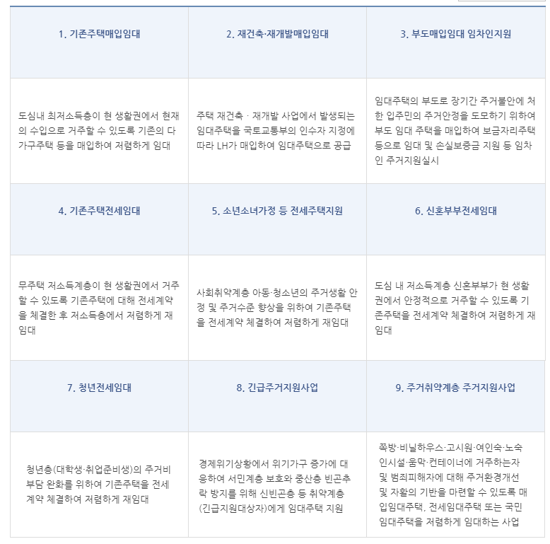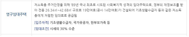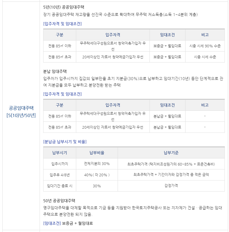 주택공급에 따라 국민주택, 민영주택으로 구분되며 공사 공급주택의 유형에 따라 공공분양주택, 분양전환 공공임대주택, 국민임대주택, 영구임대주택, 민영주택으로 구분되기도 합니다.
